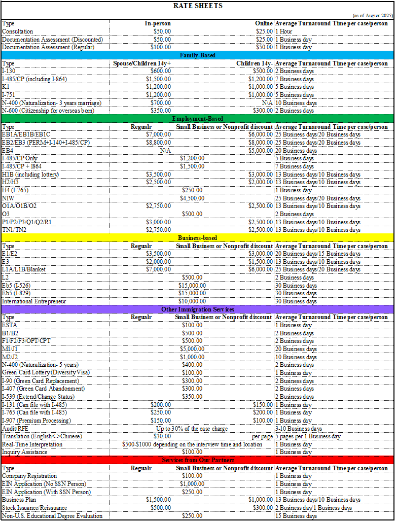 - The following rate sheets reflect service fees only and do not include USCIS filing fees.