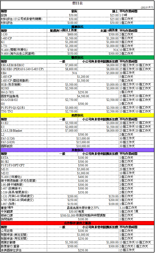 • 以下價格表僅為本公司之服務費用,不包含美國移民局(USCIS)所收取的官方申請費用。